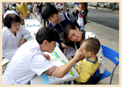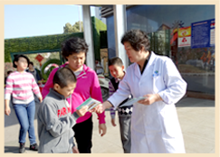 六一专家团义诊下基层,在济南全程公园义务为孩子、家长们分发健康手册,增强孩子保健意识